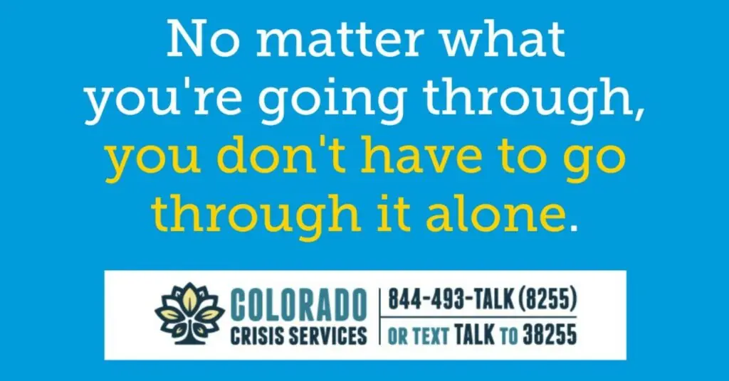For help with any mental health, substance use or emotional concern—for you, or someone you know—call Colorado Crisis Services at 844-493-TALK (8255), or text TALK to 38255. Trained counselors provide immediate and confidential help, 24/7/365. For more information, or to find a crisis services walk-in center, click on the picture above or visit ColoradoCrisisServices.org